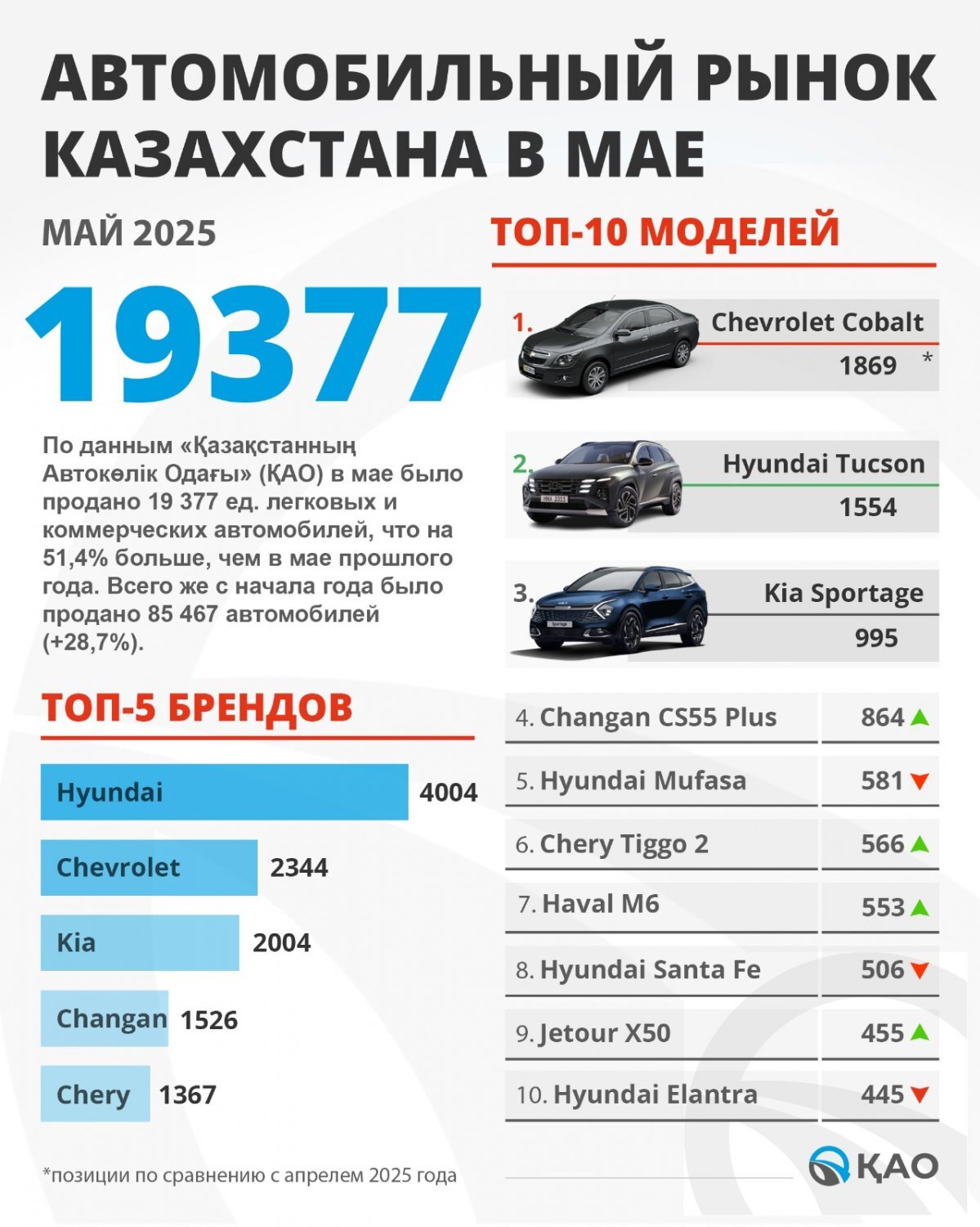 Согласно данным Казахстанского автомобильного союза (ҚАО), за первые пять месяцев 2025 года в стране реализовано 85 467 транспортных средств — рост на 28,7% по сравнению с аналогичным периодом прошлого года. В мае было продано свыше 19 тысяч единиц, что на 51,4% превышает показатель мая 2024 года.
